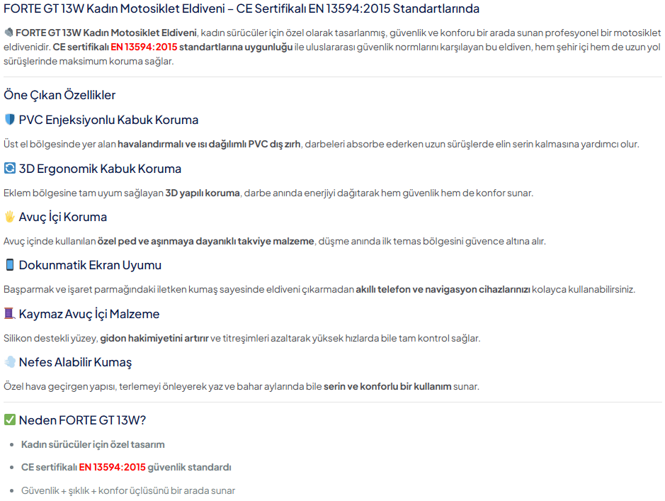 Forte GT RS13W Eldiven, şık siyah tasarımı ile hem güvenlik hem de konfor sunar. Elinizi sarmakla birlikte esneklik sağlar. Uzun yolculuklarda elinizin rahatlığını korur. Hava koşullarında ekstra koruma sağlayan yapısı ile sürüş keyfinizi artırır.